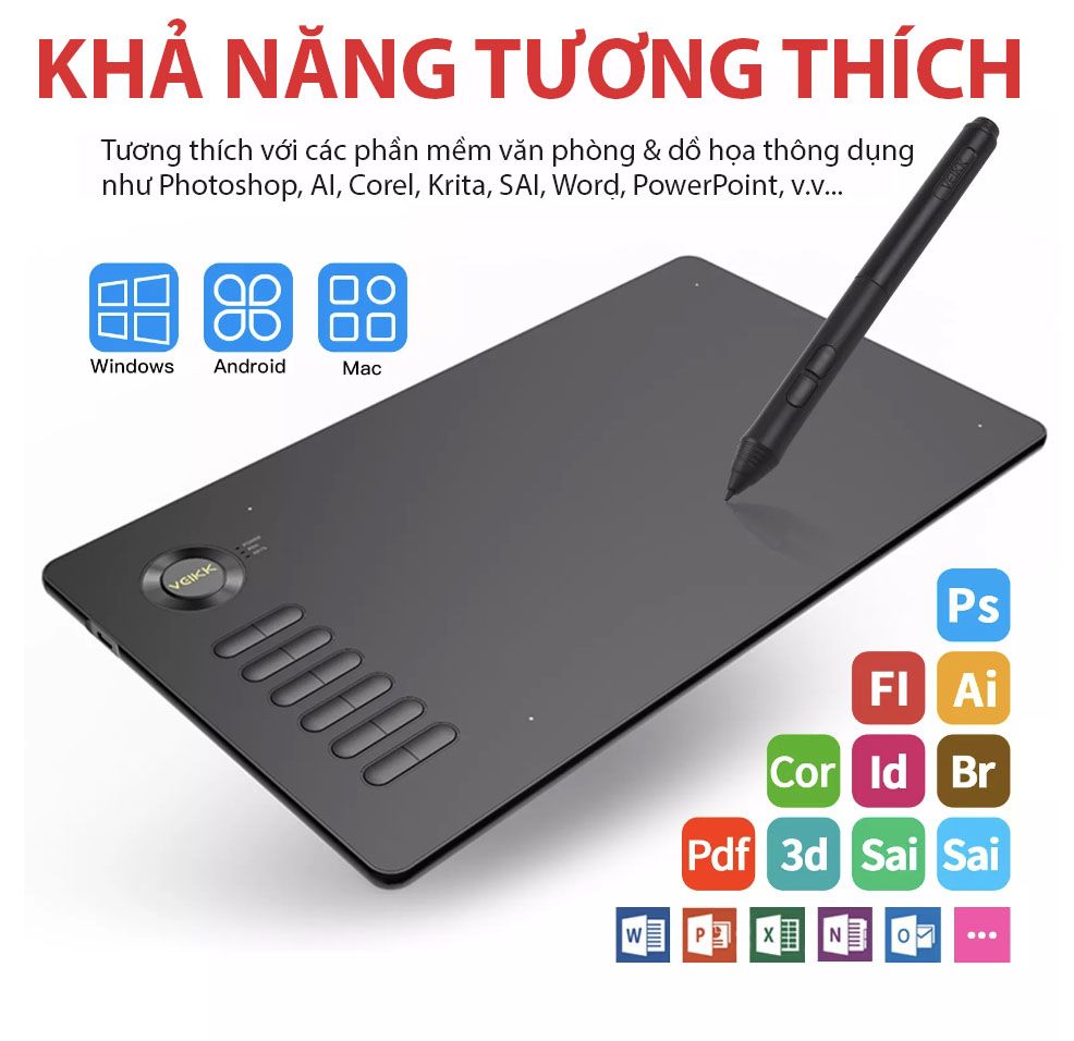 Tương thích với các phần mềm đồ họa và văn phòng như Photoshop, AI, SAI, Illustrator, Corel, Krita, Word, Excel, PowerPoint, v.v…phù hợp cho việc vẽ tranh, làm hoạt hình, minh họa, thiết kế trang phục, v.v…