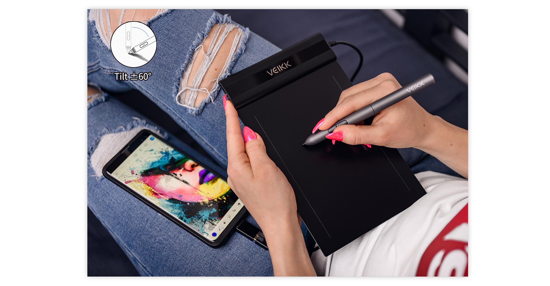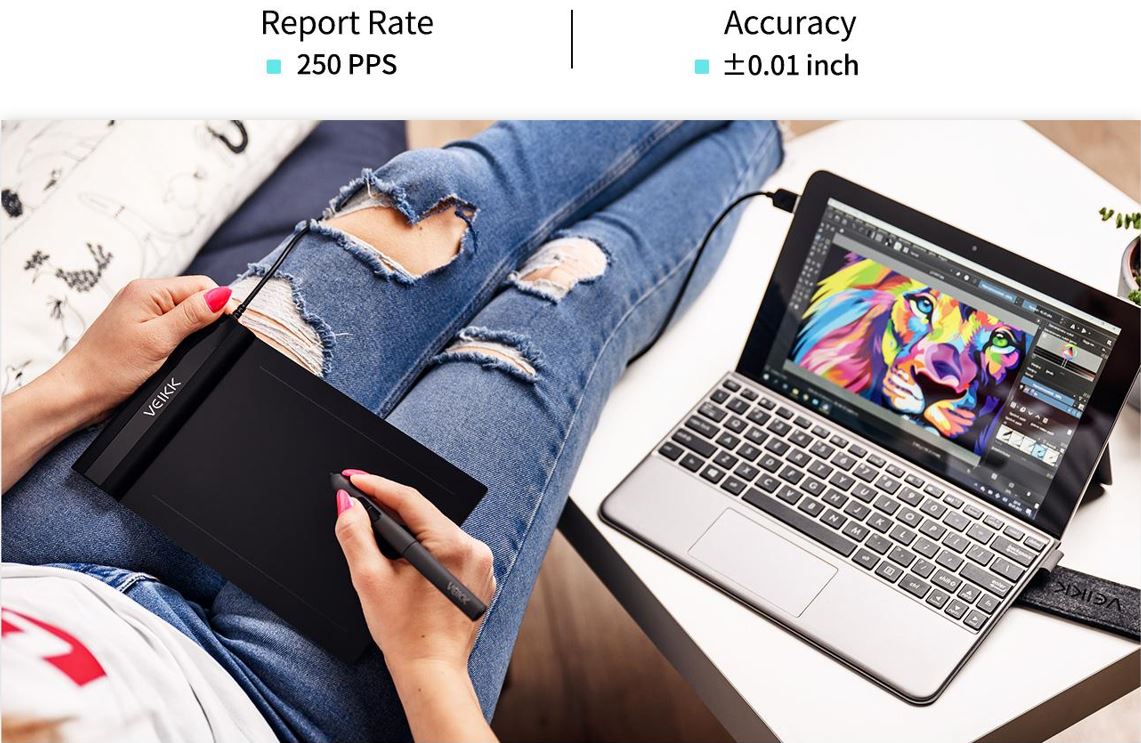 Bảng Vẽ Đồ Họa Kỹ Thuật Số Veikk S640 (6x4 Inch) có thiết kế siêu mỏng chỉ 2mm và nhỏ gọn cỡ 1 gang tay, vùng hoạt động 6x4 inch, trọng lượng siêu nhẹ 176gr, dễ dàng mang theo bất cứ nơi đâu.