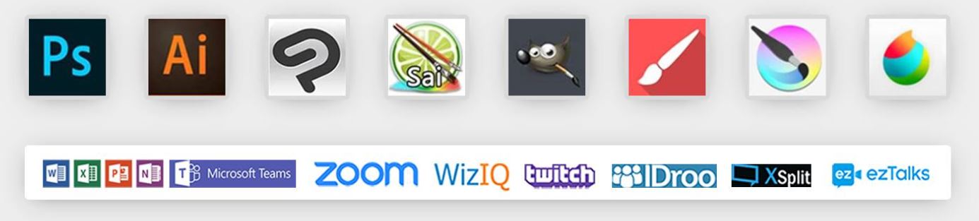 Bảng vẽ VEIKK có thể sử dụng với các phần mềm đồ họa và giảng dạy trực tuyến như: Zoom, Microsoft-Teams, hội thảo trên web Eztalks, XSplit, Twitch, v.v.