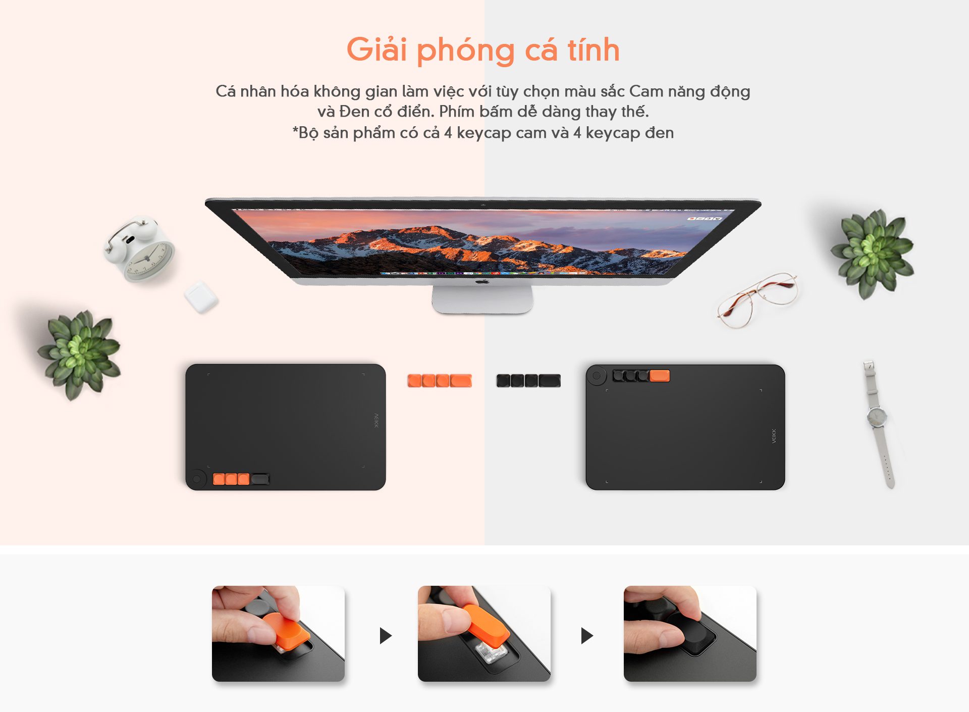 Các ngón tay của bạn lướt nhẹ nhàng trên bề mặt nhám mờ của phím bấm – và nắp phím có thể thay thế nhiều màu sắc giúp bạn dễ dàng thiết lập chức năng phổ biến nhất như Ctrl+Z hoặc các chức năng khác. Giải phóng cá tính trên không gian bàn làm việc của bạn và Sở hữu cả màu nắp phím với Cam sống động và Đen cổ điển.