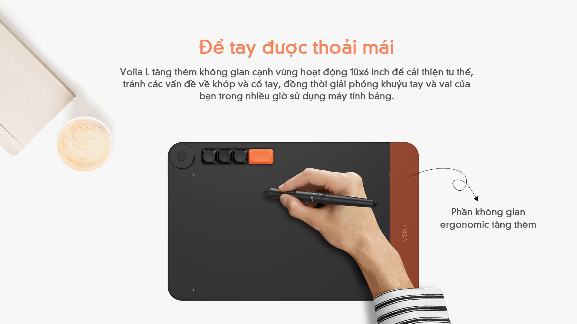 VEIKK Voila L đã tăng thêm không gian tiện dụng bên cạnh khu vực hoạt động 10×6 inch để cải thiện tư thế của bàn tay và cổ tay, tránh các vấn đề về khớp và cổ tay, đồng thời giải phóng khuỷu tay và vai của bạn trong nhiều giờ sử dụng bảng vẽ. Bề mặt nhám mờ được thiết kế để phù hợp với bàn tay của bạn tốt hơn và mượt mà hơn bạn nghĩ. Sử dụng thật thư thái và thoải mái kể cả khi ở nhà, văn phòng hay quán cà phê, v.v. Hãy giữ cổ tay thẳng hàng thay vì nghiêng so với bàn trong hầu hết thời gian sử dụng.