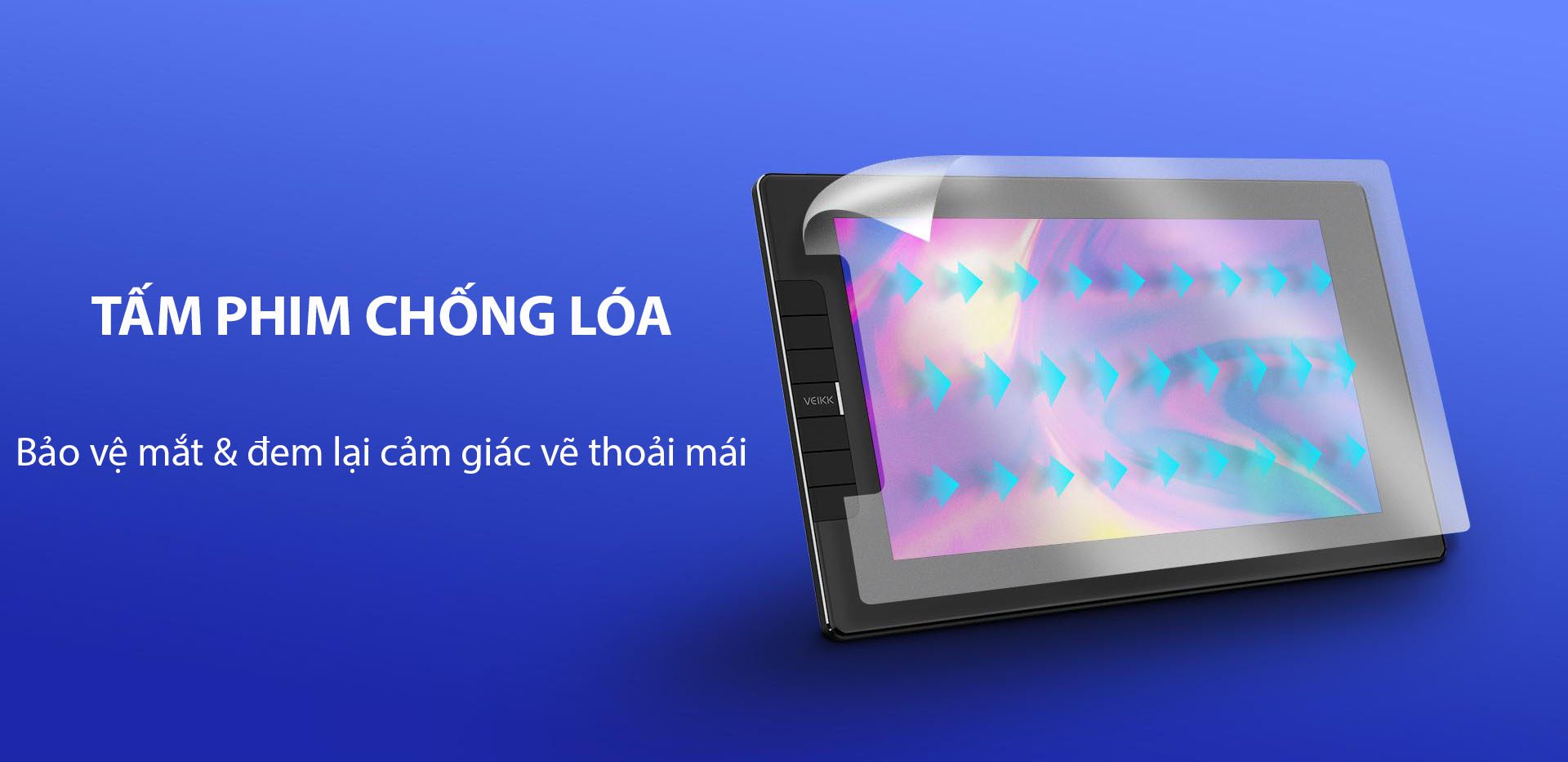 Khi mua bảng vẽ màn hình VEIKK VK1200 đã được dán sẵn 1 tấm film bảo vệ màn hình & giúp chống lóa khi bị ánh sáng chiếu vào, đem lại tầm nhìn dễ chịu, không gây mỏi mắt trong suốt thời gian dài sử dụng.