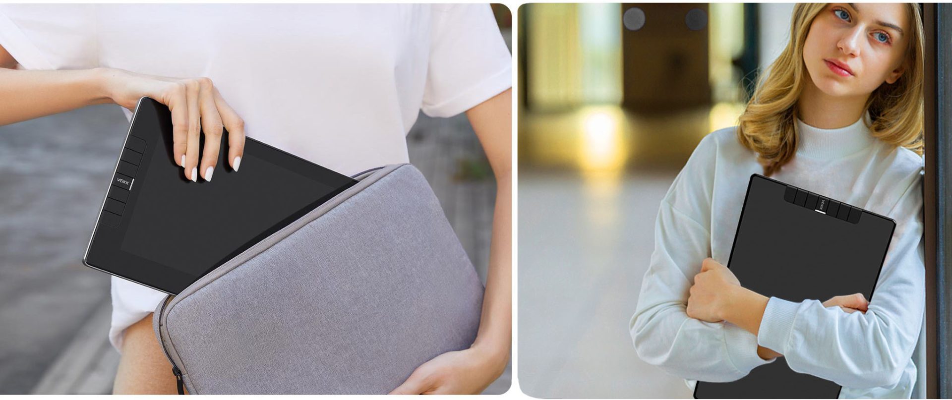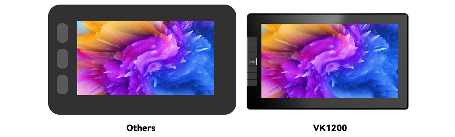 Bảng vẽ VEIKK VK1200 có thiết kế Full-screen không có khung viền màn hình. Nhờ đó kích thước tổng thể của VK1200 nhỏ hơn nhiều những bảng vẽ khác có cùng kích thước màn hình