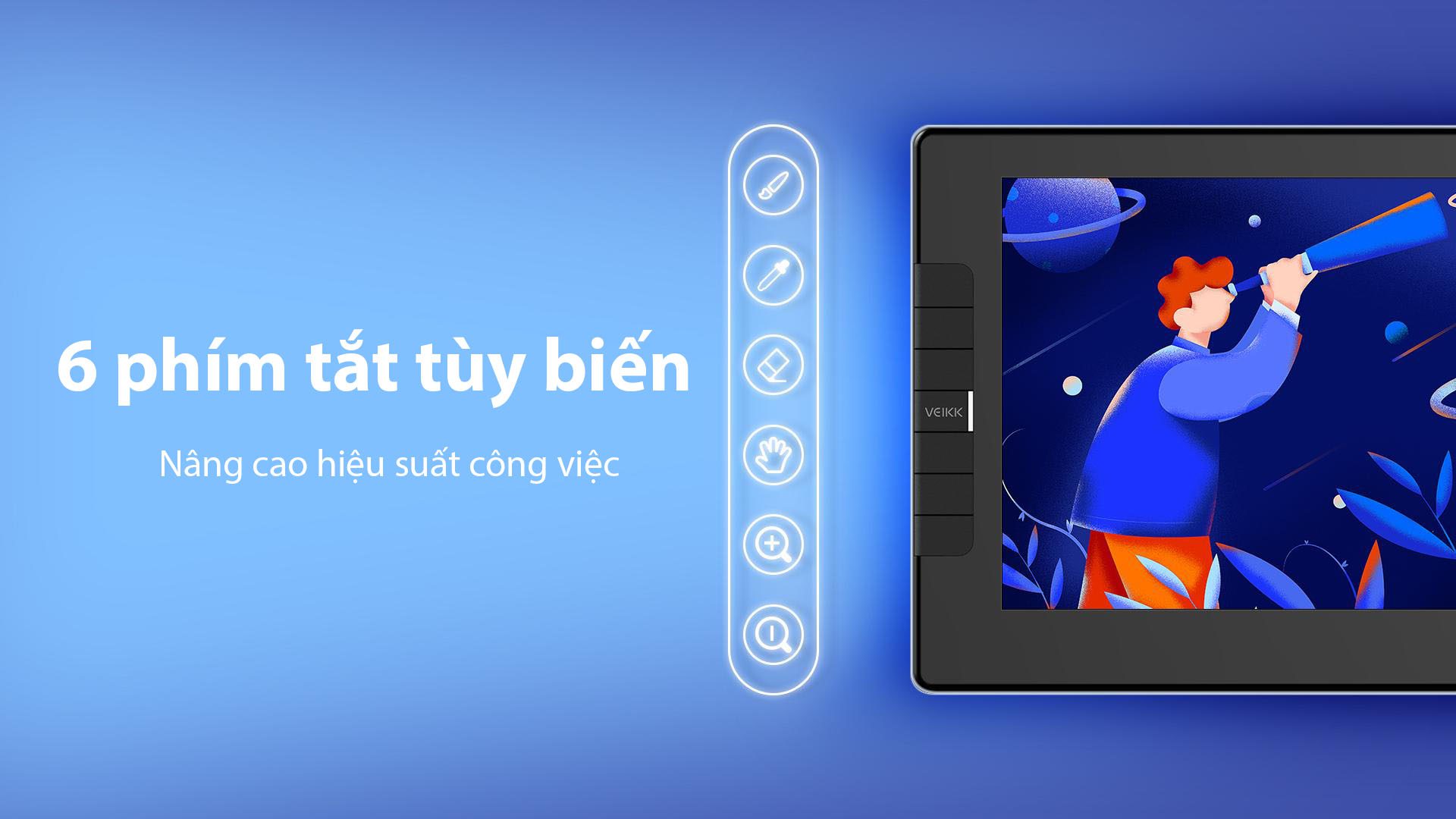 VEIKK VK1200 trang bị 6 phím thao tác nhanh Express Key có thể tùy chỉnh mọi chức năng: Phóng to thu nhỏ, Undo, Save,v… Nút bấm bo cạnh và liền mạch với tổng thể chung đem lại dáng vẻ thanh thoát, sang trọng. Giờ đây bạn có thể thiết lập các tính năng cho Express Keys theo các phần mềm khác nhau với số lượng không giới hạn.