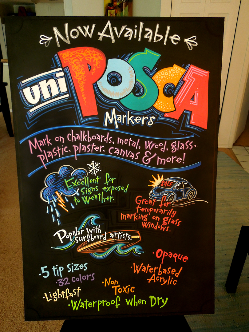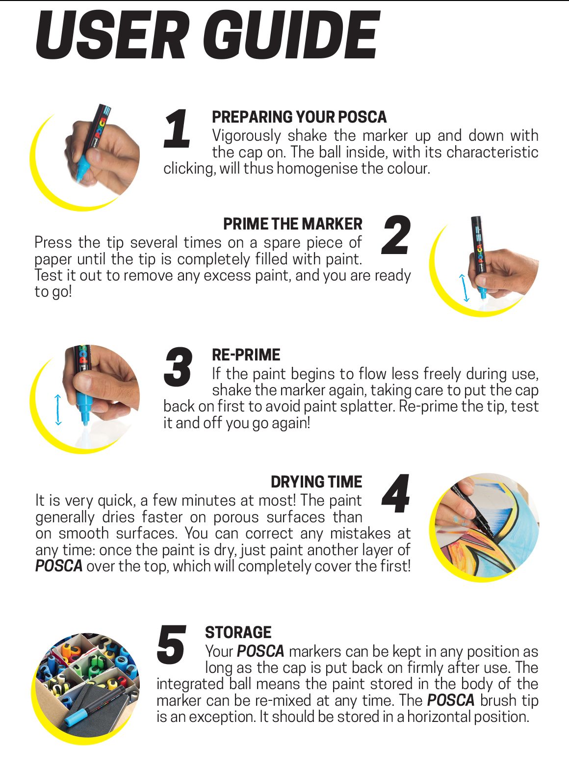 Bút Marker Uniball Posca là loại bút marker sử dụng mực pigment gốc nước. Nhờ loại mực này mà bút có thể cho ra màu sắc tươi tắn, đậm như các loại màu poster, và có thể vẽ lên bất kỳ chất liệu nào. Khi vẽ, bút có thể dễ dàng rửa trôi bằng khăn ướt, nhưng khi mực khô sẽ có tính kháng nước. Vì vậy bút Uni Posca chống phai, có thể sử dụng để vẽ bảng hiệu ngoài trời, vẽ trang trí.