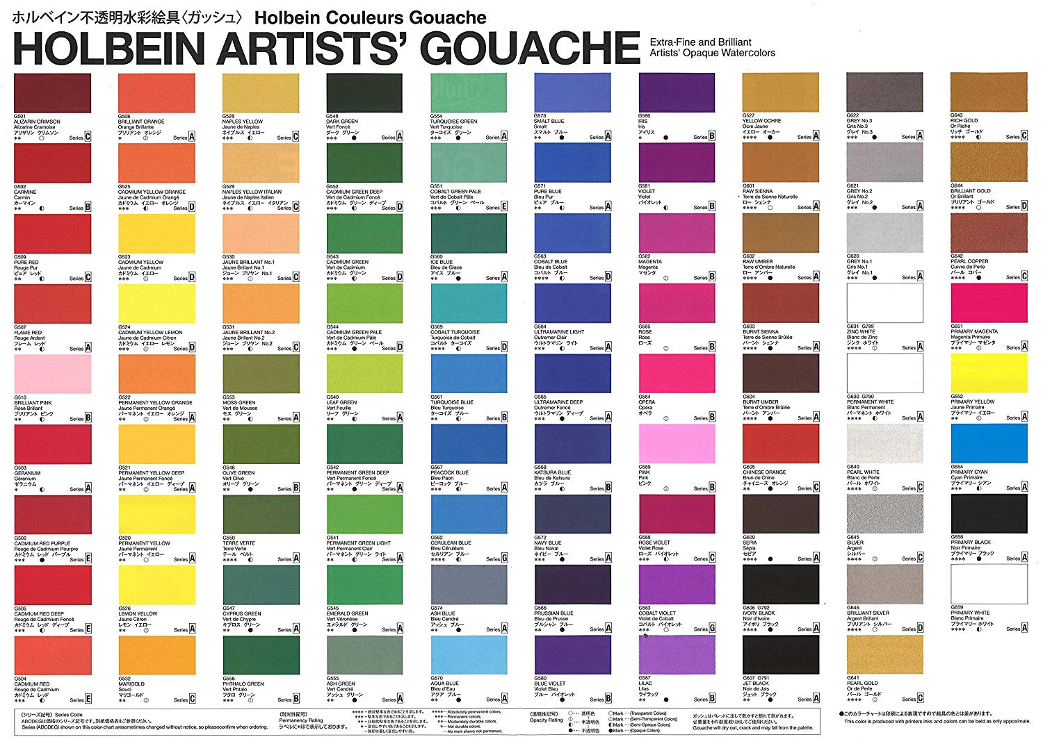 Bảng màu Holbein Artists' Gouache có 89 màu, trong đó có 5 màu thuộc hệ thống màu CMYK.