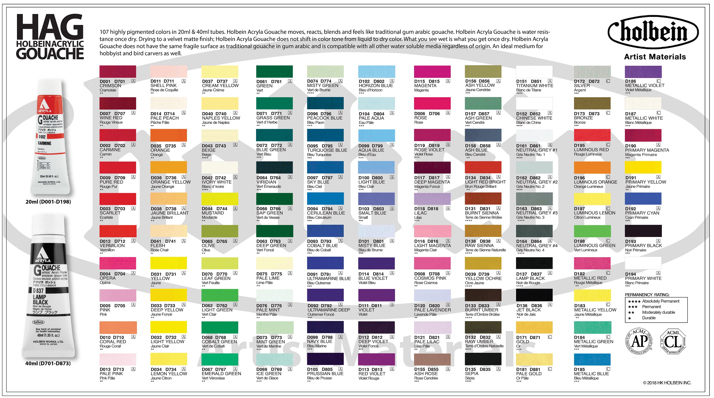 Bảng màu Acryla Gouache của Holbein rất phong phú, với 109 màu gồm các tông đỏ, vàng, cam, xanh dương, xanh lá, nâu, đen, trắng. Ngoài các tông màu thông thường, bảng màu còn có tông pastel, màu nhũ metallic, màu phát sáng Luminous, đặc biệt là màu Super Opaque Black, White có độ phủ mạnh hơn màu đen, màu trắng thông thường.