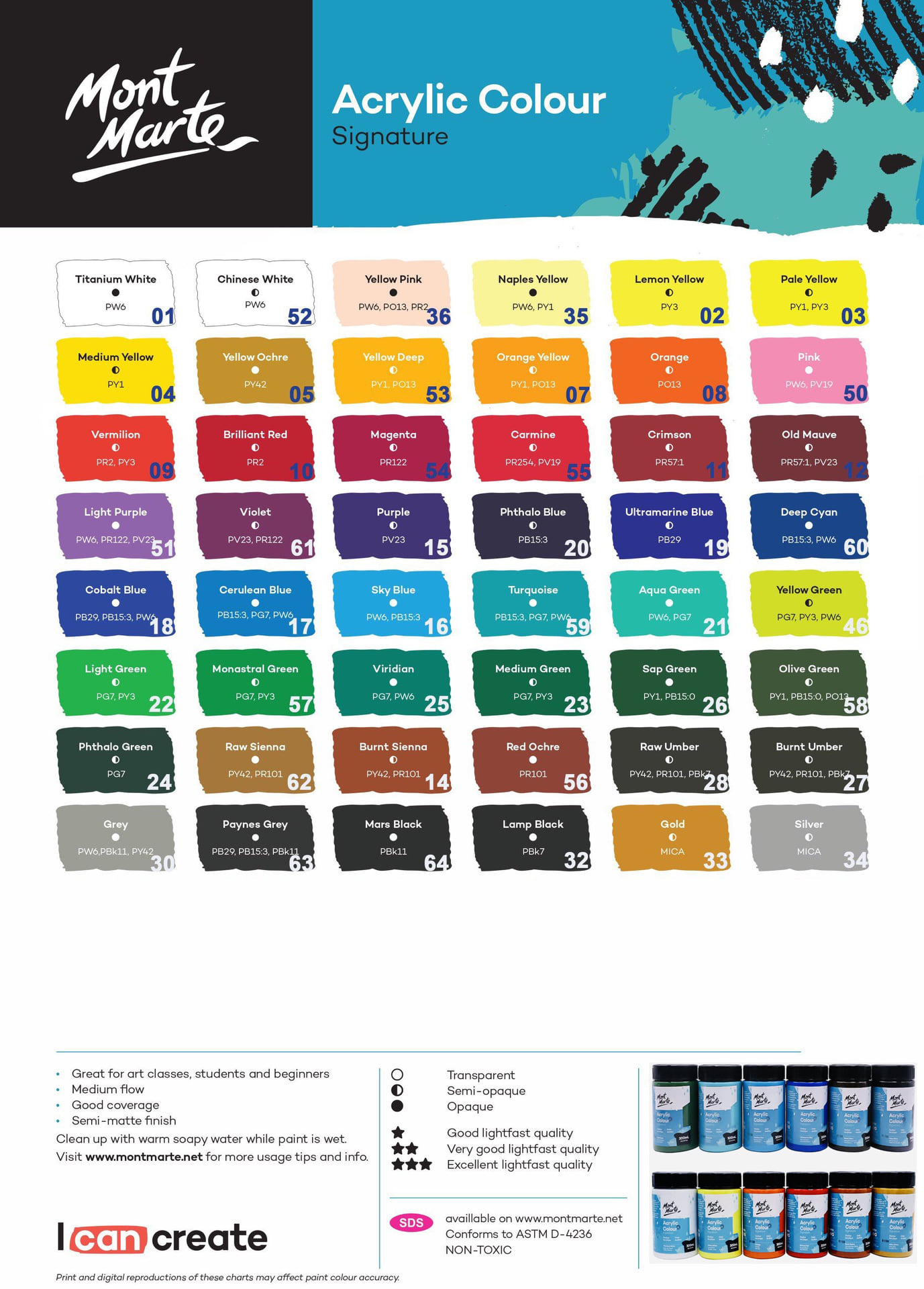 Mont Marte Signature Acrylic là dạng acrylic thông dụng, vừa có thể sử dụng để vẽ tranh trên canvas, trên bìa, lẫn có thể dùng để vẽ trên vải, da, gỗ, đất sét, đất nung v.v.