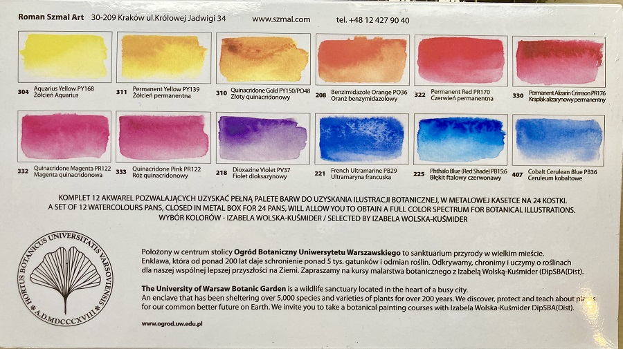 Set do họa sĩ màu nước Isabela Wolska-Kusmider vẽ bìa và lựa chọn bảng màu, bao gồm các màu: Aquarius Yellow, Permanent Yellow, Quinacridone Gold, Benzimidazole Orange, Permanent Red, Permanent Alizarin Crimson, Quinacridone Magenta, Quinacridone Pink, Dioxazine Violet, French Ultramarine, Phthalo Blue Red Shade, Cobalt Cerulean Blue.