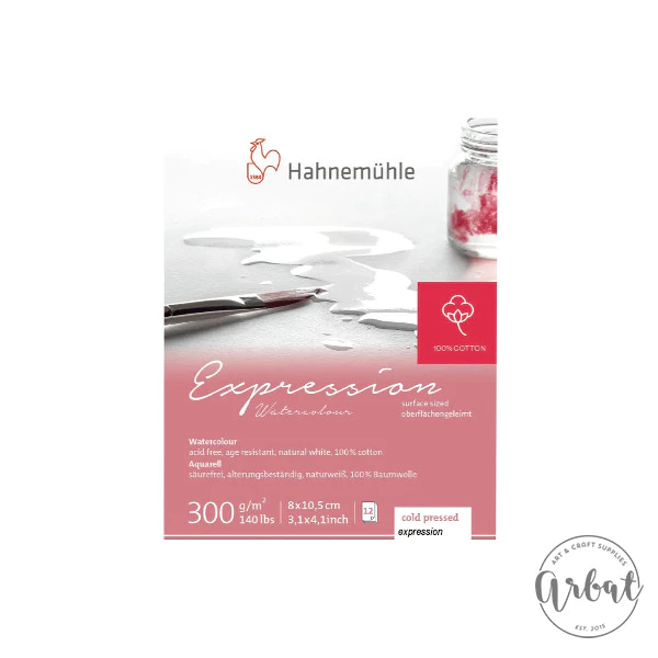 Expression Watercolour của Hahnemühle là loại giấy cao cấp làm từ 100% cotton, định lượng 300 gsm, bề mặt Cold Pressed (nhám vừa) cùng xử lý “surface sized” giúp màu nổi bật và kiểm soát tốt kỹ thuật ướt.