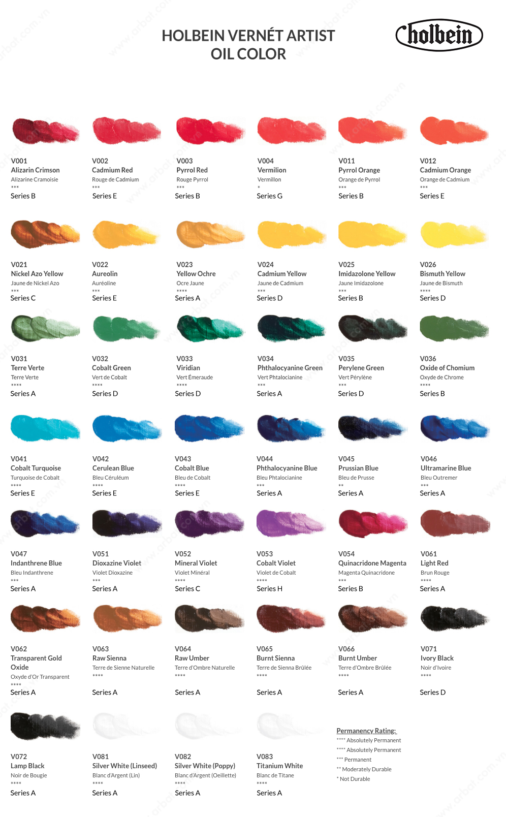 Màu được làm từ pigment cao cấp nguyên chất, pha với dầu lanh tinh chế (trừ màu Silver White Poppy được làm từ dầu hạt anh túc), cho màu bám tốt hơn lên tranh, bền màu với thời gian, đường nét mượt mà. Mỗi màu Vernet đều làm từ pigment đơn, giúp màu trong hơn, không bị đục khi pha màu. Với bảng màu gồm 40 màu, Vernet là bảng màu mơ ước dành cho các họa sĩ bậc thầy trong tương lai.